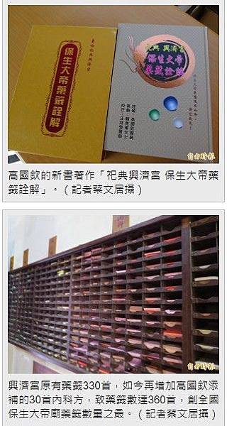 祀典興濟宮供奉保生大帝醫神,藥籤是全國保生大帝廟宇中最多、最完備者。中醫師高國欽將其臨床經驗和藥籤結合研究,十四日發表《祀典興濟宮保生大帝藥籤詮解》一書,期能結合藥學、歷史和文化成為經典鉅作。