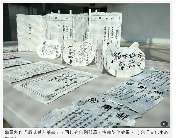 學員創作「貓咪偏方藥籤」,可以有告別孤單,療癒陪伴效果。 (台江文化中心提供)
