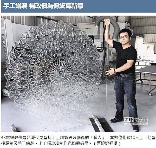 一筆一畫悉心在玻璃細膩作畫,43歲楊政儐是台灣少見堅持手工繪製玻璃藝術的「職人」,當數位化取代人工,他堅持原創及手工繪製,上千幅玻璃創作宛如藝術品,「做別人不願意做的事,走出一條自己的路」,希冀為傳統玻璃工藝開創新局。
