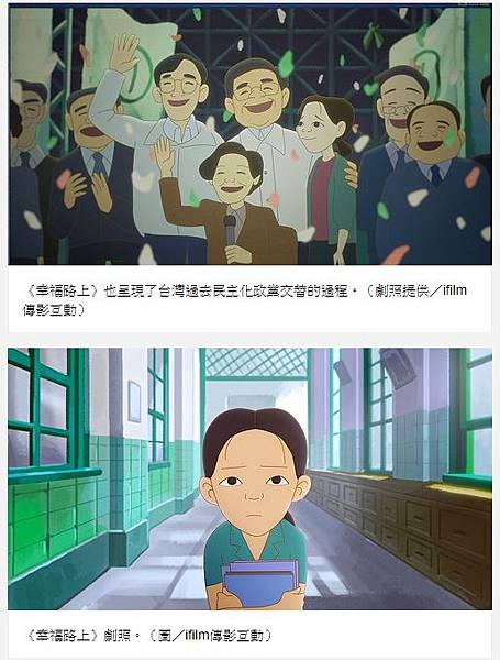 作為一部動畫,《幸福路上》的基調是寫實的,除了小琪那些「幻想」或「夢境」的畫面。這些非寫實的、甚至超現實的幻夢片段,除了在「動畫裡的動畫」展現動畫獨有的線條流動、色彩渲染、塑形與變形、疊映或溶剪等等特質 (因而有一種後設意味) 之外,還提出了一個隱含的政治批評:小琪那一代的「幻想」或「夢境」,幾乎都是由日本製作的、脫亞入歐(美)而「擬狄斯耐風格」的、或許由台灣代工的卡通,所構築而成,比如「小甜甜」。(所以日本在小琪那個「黨國抗日」的成長階段裡其實也並沒有完全缺席)──連小琪在腦海裡重現表哥阿文以左獨啟蒙對抗黨國法西斯這段歷史時,竟然是美日卡通(或童書)裡的「王子歷險記」。當迪士尼、皮克斯、宮崎駿、新海誠佔據了孩子與青少年的想像時,我們該怎麼想像台灣的未來?──這或許正是宋欣穎導演最後決定讓《幸福路上》這部台灣電影以動畫形式呈現的主因之一:我們 (從戰後嬰兒潮到六年級世代) 從美日觀點想像台灣,如今,下一個世代能否以台灣觀點想像台灣呢?