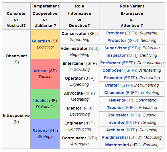 不久前剛過世的加州州立大學榮譽教授 David Keirsey ,最著名的貢獻「柯塞氣質量表( Keirsey Temperament Sorter )」,將結果詮釋為 4 種氣質與 16 種性格,而這 16 種性格正與 MBTI 的 16 種人格特徵有關,彼此互為參照,形成下面的對應表格。