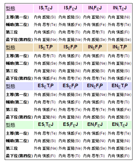 2. MBTI職業性格測試附上 Wiki 找到的主導類型判別表,這些分類在 CAP ( The Center for Applications of Psychological Type )的網站上提供了 16 個類型的基本介紹。
