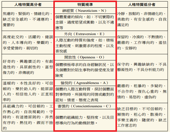 現在比較有名的「 OCEAN 」分類是 Costa & McCrae ( 1985 )提出來的: