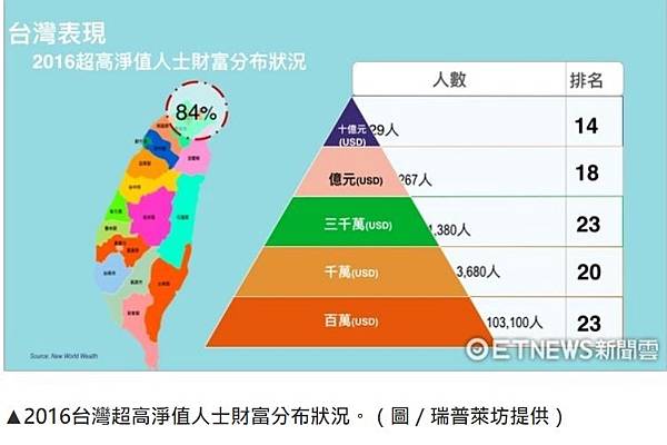 台灣「百萬美元」富豪將近76萬人,全球排名第15多,高於香港的64.7萬人,也快要是新加坡的兩倍。