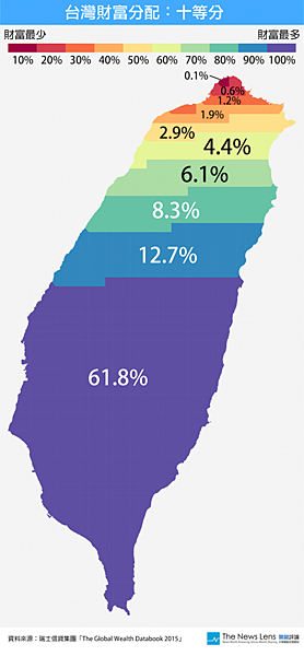 台灣每名成人的財富平均為31萬2075美元(約新台幣923萬元),排全球第15名,但用中位數來看,台灣每名成人的財富中位數為11萬4871美元(約新台幣339萬元),和新加坡、南韓一樣,都是平均財富成長速度快於中位數。
