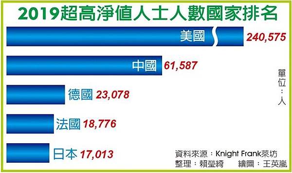 美國則第1名,有2300多萬人。去年美國超過37.9萬人躋身新的百萬富豪,平均每天增加1000多人,中國則以630多萬人排名第2。