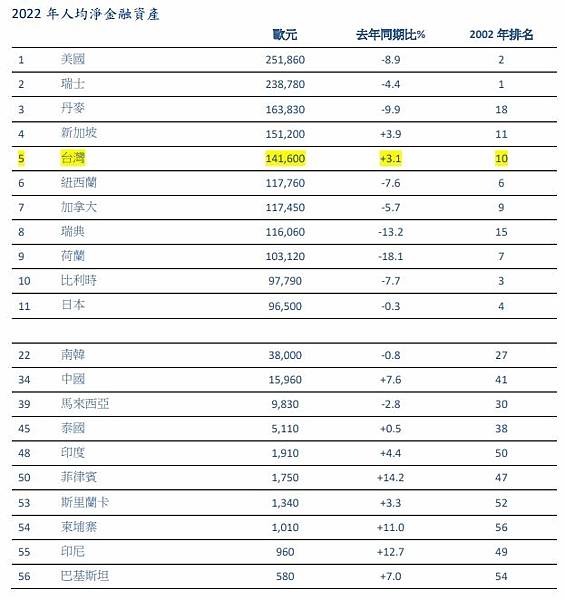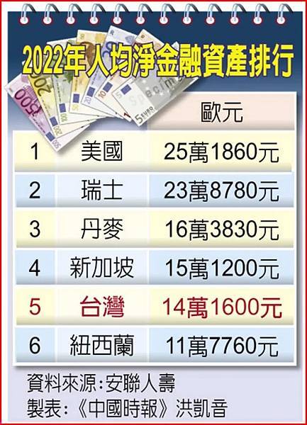 該報告調查,前5名的人均金融資產淨值排名,第1名為美國26萬320歐元(約新台幣915萬元)、年增9.8%,第2名瑞士25萬5440歐元(約新台幣898萬元)、年增2.5%,第3名為丹麥17萬2200歐元(約新台幣605萬元)、年增4.3%,亞洲區的新加坡、台灣則位居第4、5名,各為17萬1930歐元(約新台幣604萬元)、年增7.1%及14萬8750歐元、年增9.9%。