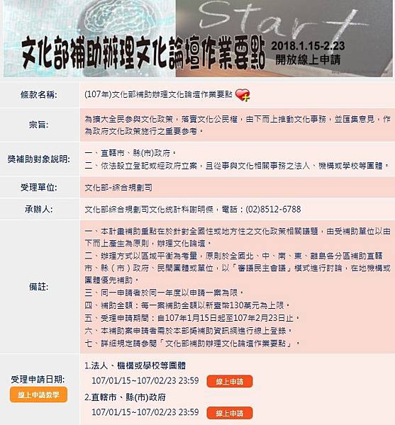 有關補助相關申請文件及內容,歡迎至文化部獎補助資訊網(http://grants.moc.gov.tw/Web/)查詢及下載。(生活中心/台北報導)