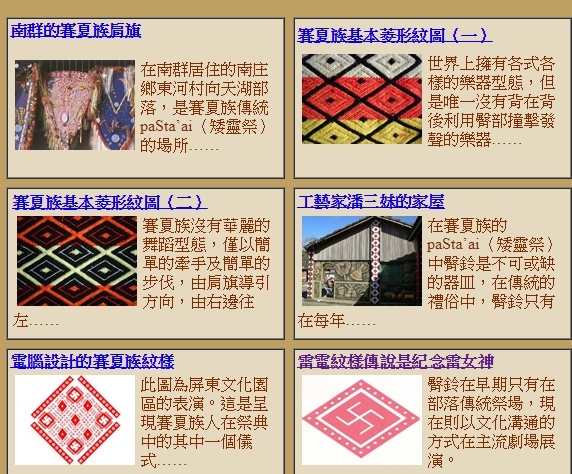 一、 菱形紋:菱形的形狀,就像是人的雙眼一樣,賽夏族人認為菱形是祖靈的眼睛,所以將菱形織在服飾上,就像是祖靈守護著族人,同時也是告誡族人不可以作壞事。