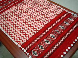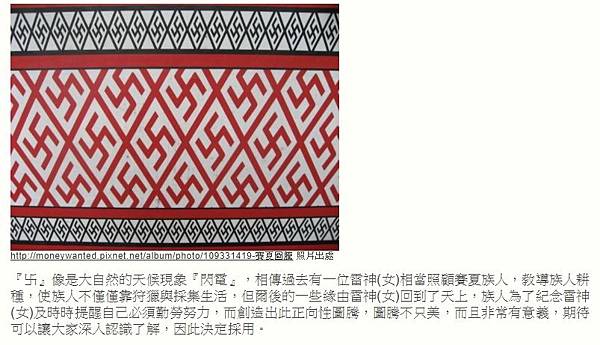 二、 卐字形紋:『卐』像是大自然的天候現象『閃電』,相傳在過去有一位雷神非常照顧賽夏族人,在凡間的時候,幫助賽夏族人耕種,日復一日,賽夏族人越來越懶惰,有一天雷神從田裡回到家後,肚子非常的餓,就請人去煮飯,但是煮飯的人卻懶得煮,把鍋灰拿給雷神吃,雷神終於受不了了,憤怒的回到天上,賽夏族人這才驚覺自己犯下大錯,於是將類似『閃電』的圖紋織在服飾上,來紀念雷神並且約束自己的行為,提醒自己要勤勞不要懶惰,不然會再次發生同樣的事情。