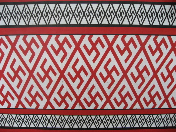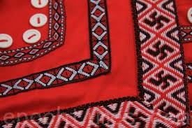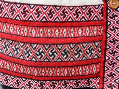 此為2006年攝於苗栗南庄-向天湖祭場,正逢賽夏族十年大祭。照片中的符號並非萬字符,乃賽夏族神話中,象徵雷女的紋路。符號意像來自於打雷時,天空中交錯的閃光,經常運用於傳統服飾中。雷女Wa:on乃神話傳說中,將小米種子賜予族人,及教導耕種的女神。傳說中娃恩下凡後下嫁賽夏族男子,而因其不能動廚房的事務,然而賽夏族女人乃需在廚房操持家務,夫家要求娃恩要下廚,最後娃恩不得已之下,在轟隆一聲之下變成一株芭焦樹,而夫家則後悔不已。賽夏族雷女紋(wa:on) - shiaochin - 數位島嶼 - https://goo.gl/RsxsyN