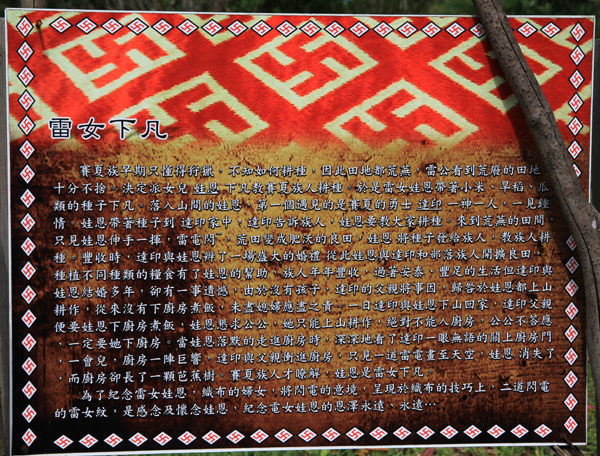 身上流著賽夏族血液的南庄國小校長日智衡,也說起一段愛情故事;古時候賽夏族人不懂得編織與農耕,於是天上雷神就派出精於編織手藝的女兒娃恩,下凡教導,雷女到人間後與賽夏青年達印結為夫妻,教導族人種植小米、苧麻。