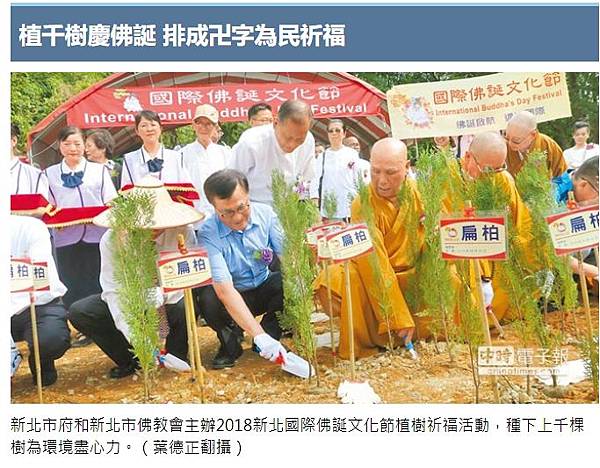 慶祝佛陀誕辰(農曆4月8日),新北市政府和新北市佛教會22日共同主辦2018新北國際佛誕文化節植樹祈福活動,活動在土城淨慈寺種下近2000棵扁柏、肖楠及仙丹,並排列成直徑12米的佛教標誌大型卍字,表達聚集佛法根本來為民眾祈福。