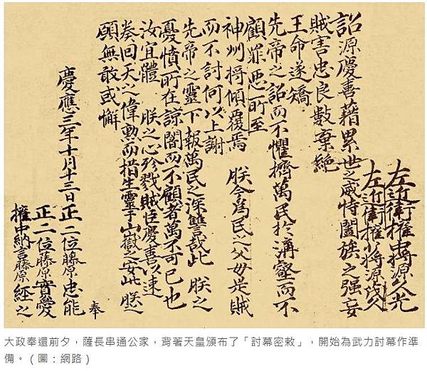 大政奉還前夕,薩長串通公家,背著天皇頒布了「討幕密敕」,開始為武力討幕作準備。(圖:網路)