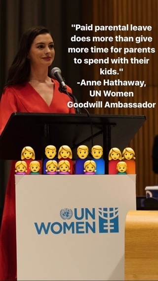 光輝燦爛的三月八號,安海瑟薇站上聯合國講台,她是今年度的聯合國親善大使,她一開口,直截了當地提到產假問題多有缺漏,更直指美國是所有已開發國家中,尚未建立完善有薪產假制度的國家。