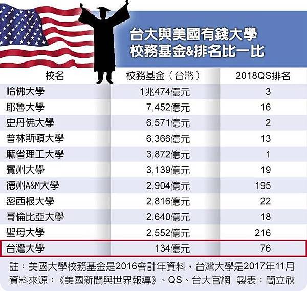 相較之下,排名76名的台大,校務基金截至2017年11月是134億元台幣,連前述美國大學的1/10都不到;這還不提扣掉教職員薪水、水電設備等固定開支,台大年年入不敷出。