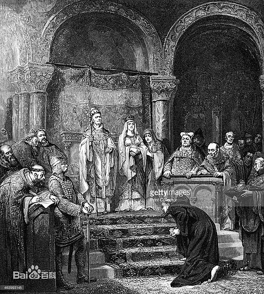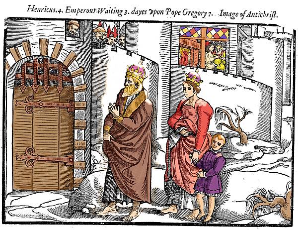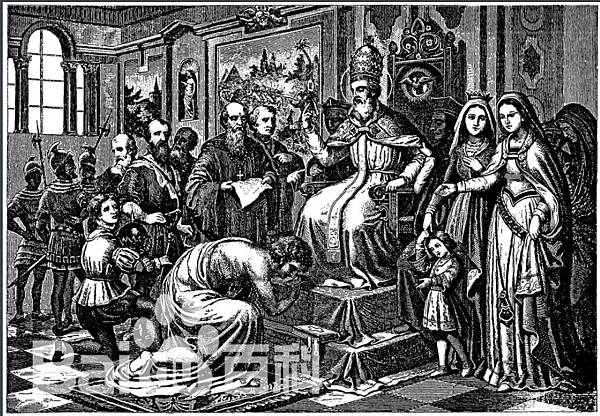 皇權與教權的鬥爭,由於德意志國王亨利四世(1056-1106)和教皇格里高利七世於1077年在卡諾莎的會晤,達到了戲劇性的高潮。當時,教皇應德意志封建領主們的邀請,準備前往德意志調停他們與國王之間的爭端。為使教皇取消此行,亨利不顧路途危險,在冬季越過阿爾卑斯山前往意大利。教皇得知他已越過阿爾卑斯山脈的消息後,為審慎和保險起見,決定前往托斯卡納邊疆伯爵夫人馬蒂爾達位於卡諾莎的城堡。被稱為“聖彼得的女兒”的這位伯爵夫人,擁有巨額財富和權勢,她那位遭人厭惡的丈夫已於上一年去世。她保持了一個規模龐大的宮廷,身邊簇擁著一大批滿嘴甜言蜜語的馬屁精和油頭粉面的空頭評論家。倫巴第的貴族們盼望著亨利的到來,能夠使他們從醉心於權利的教皇那裡獲得解放,因此對這位國王的駕臨熱烈歡迎,盼望他前往羅馬加冕後,用一個更加順從的人選替換掉格里高利七世。為了保障亨利此行一舉奏效,他們還做好了組織一支軍隊的準備。然而亨利根本不理會他們的這種願望,而是急切地希望向教皇懺悔,以換取後者在德意志恢復權威的諒解。前往卡諾莎城堡後,身披麻氈,雙腳赤裸,在風雪中等候許久,教皇才允許他進入城堡相見。格里高利七世的處境很尷尬:如果聽任亨利獨斷專行,那麼他將在無力製之;如果拒絕他的要求,則勢必遭致報復,而自己並不能得到教眾的支持。三天之後,教皇做了讓步,給了這位懺悔者一個赦罪的吻。亨利承諾將尊重教皇就他與德意志封建領主之間鬥爭的裁決,並保證在自己的王國全境將不興刀兵。然後,亨利匍匐在教皇面前,展開雙臂,使全身呈十字形,接受了教皇的寬赦。在和解後進行的宴會上,國王一物不食、一言不發,只是鬱悶地用指甲在餐桌上塗畫些什麼。