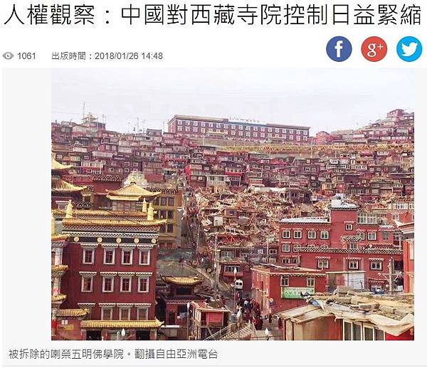 國際人權組織「人權觀察」25日表示,中國當局迫害宗教自由的惡行又添一樁。位於西藏色達縣的「喇榮寺」於2017年遭拆除僧舍、驅逐僧尼(清人拆房)後,其管理、財務、安全、招生甚至教材選擇等事務已由大約200名共黨幹部和普通官員全面接管。