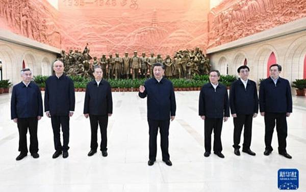 中共政治局常委會成員,包含李希、蔡奇、趙樂際、習近平(總書記)、李強、王滬寧、丁薛祥(由左至右),這些人將來退休可享受豐厚優遇。 圖:翻攝自新華社