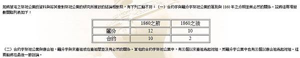 如將草屯之祭祀公業的資料與莊英章對祭祀公業的研究所獲致的結論相對照,有下列二點不符:(一)合約字與鬮分字祭祀公業的區別與 1860 年之分期並無必然的關係。茲將這兩項變數關聯列表如下: