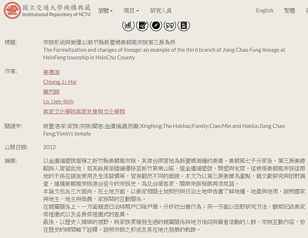 國立交通大學機構典藏:宗族形成與變遷:以新竹縣新豐鄉姜朝鳳宗族第三房為例 - https://goo.gl/jCMndh