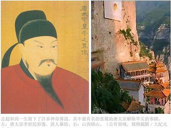志超和尚一生留下了許多神奇傳說,其中最有名的當屬助唐太宗解除旱災的事蹟。左:唐太宗李世民彩像,清人摹绘。右:山西綿山。(公有領域,視頻截圖/大紀元合成)