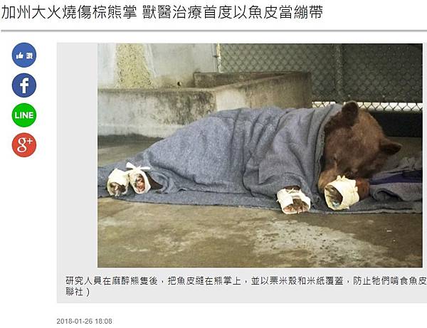 分享加州大火燒傷棕熊掌 獸醫治療首度以魚皮當繃帶到Facebook 分享加州大火燒傷棕熊掌 獸醫治療首度以魚皮當繃帶到Line 分享加州大火燒傷棕熊掌 獸醫治療首度以魚皮當繃帶到Google+
