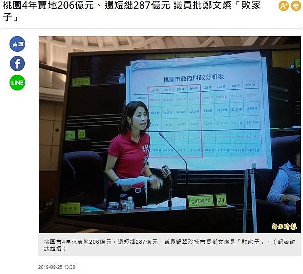 分享桃園4年賣地206億元、還短絀287億元 議員批鄭文燦「敗家子」到Facebook分享桃園4年賣地206億元、還短絀287億元 議員批鄭文燦「敗家子」到Line