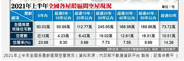 2021年上半年全國各屋齡區間空屋現況(資料來源:內政部不動產資訊平台 製表:記者徐義平 )