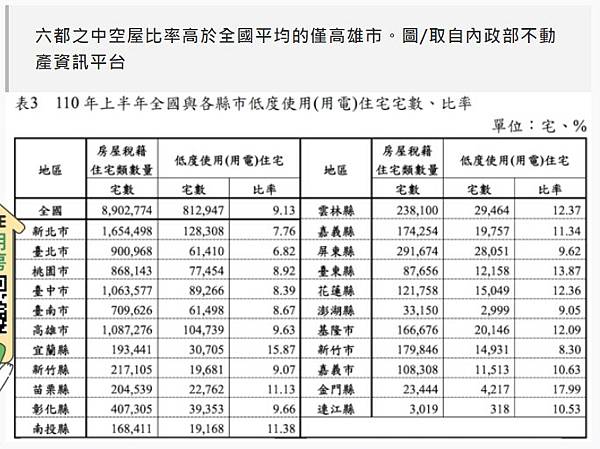 六都之中空屋比率高於全國平均的僅高雄市。圖/取自內政部不動產資訊平台