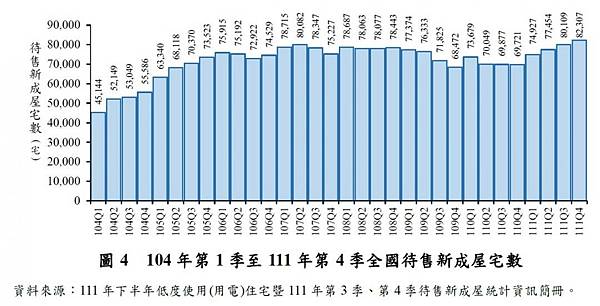 內政部表示,全國待售新成屋於2020年下半年至2021年下半年數量呈現平穩,均維持在7萬宅左右,自2022年起呈現上升趨勢,第3季8萬109宅,第4季8萬2,307宅,高於近5年平均數量7萬5,888宅,上升至統計以來新高,且較上季增加2,198宅,較上年同季增加1萬2,586宅,主因新建完成之住宅增加所致。