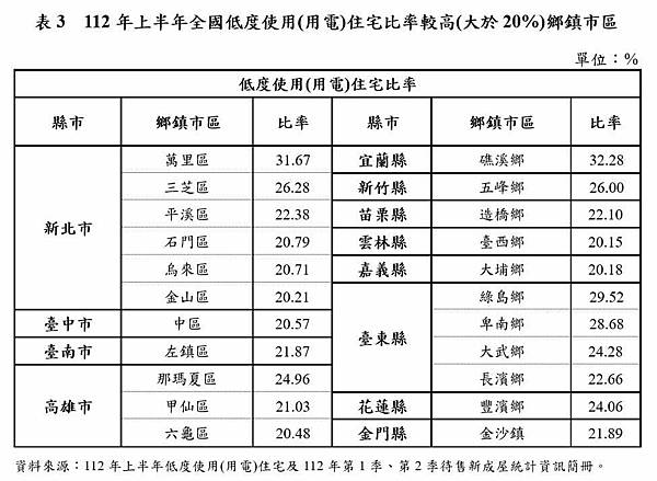依縣市別觀察,以台北市6.69%最低、新北市7.18%次低;以金門縣17.14%最高、宜蘭縣14.68%次高。其中,高雄市、宜蘭縣、新竹縣、苗栗縣、花蓮縣、新竹市及金門縣低度使用住宅比率,較上期與上年同期就鄉鎮市區別觀察,本期低度使用住宅比率小於6%的地區,由上期的8個增至18個;主要集中於6都,包括新北市土城區、永和區、樹林區、中和區、泰山區、新莊區及蘆洲區。