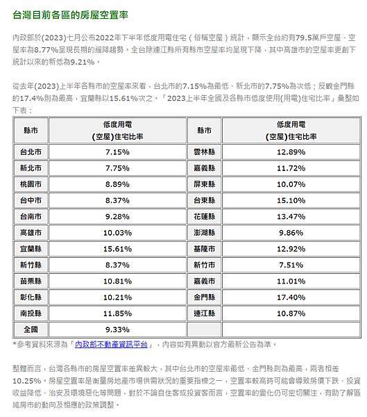 2023年H2「空屋率」空屋率超過20%的21區,新北市萬里、三芝、石門、平溪、雙溪及、烏來;高雄市那瑪夏、甲仙、六龜;臺南市左鎮;宜蘭縣礁溪;新竹縣五峰;苗栗縣造橋;雲林縣臺西;南投縣仁愛;臺東縣卑南、大武;花蓮縣豐濱;澎湖縣白沙;金門縣金沙;連江縣莒光等 21個鄉鎮市區。