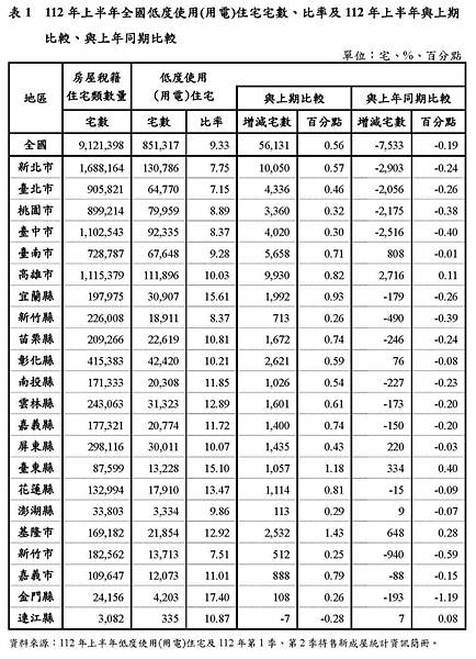 被視為空屋率指標的內政部「低度用電住宅」最新統計出爐,去(2023)年上半年全國低度使用住宅共85.1萬宅,占全國房屋稅籍住宅類宅數比率9.33%,較2022年下半年(前一期)增加5.6萬宅,但較2022年上半年減少7,533宅。內政部表示,本期低度使用住宅比率,除連江縣外,其餘縣市均較前一期增加,6都以高雄市增加幅度較大、新北市增加宅數最多。