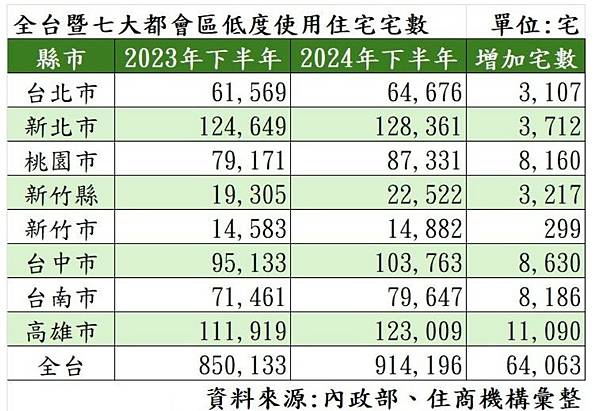 全台低度用電住宅總數達91.4萬宅,年增6.4萬戶;六都與新竹縣市中,各縣市增幅以高雄年增1.1萬戶居冠,各行政區則以總量則以桃園中壢1.8萬戶最多,各行政區年增幅則以桃園龜山1,888戶最高。2024年下半年七都低度用電住宅顯著上升,各行政區以中壢1.8萬宅居冠,各縣市年增幅則以高雄年增1.1萬宅最多,空屋壓力浮現。 https://tinyurl.com/27joqvj9