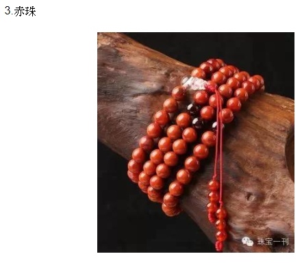 (6)赤珠:即赤真珠,所見實物一般為紅珊瑚珠。《大智度論》卷十云:『真珠出魚腹中、竹中、蛇腦中。』《佛地經論》卷一云:『赤蟲所出,名赤真珠,或珠體赤,名赤真珠。』真珠普通呈薄鼠色、灰色,赤珠則指珠之稍帶赤色者。純赤色之真珠極其難得。通常用紅珊瑚珠代替赤珠。