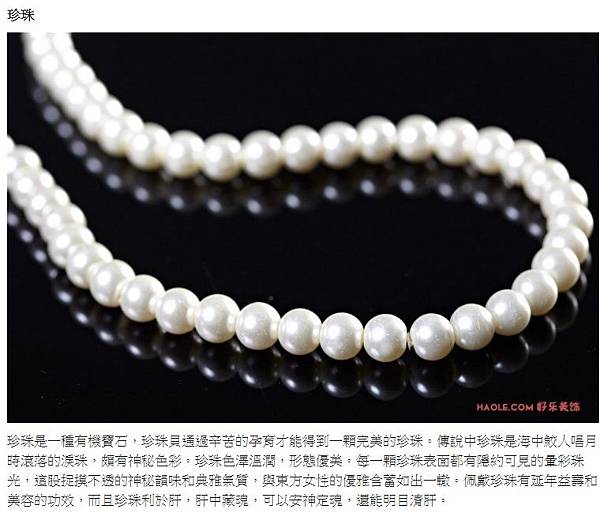 珍珠是一種有機寶石,珍珠貝通過辛苦的孕育才能得到一顆完美的珍珠。傳說中珍珠是海中鮫人唱月時滾落的淚珠,頗有神秘色彩。珍珠色澤溫潤,形態優美。每一顆珍珠表面都有隱約可見的暈彩珠光,這股捉摸不透的神秘韻味和典雅氣質,與東方女性的優雅含蓄如出一轍。佩戴珍珠有延年益壽和美容的功效,而且珍珠利於肝,肝中藏魂,可以安神定魂,還能明目清肝。