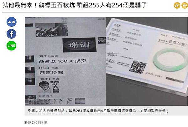 以為自己相當幸運地連番得標,花費新台幣約32萬元購得數個A貨玉石、翡翠,不料到貨後發現全是贗品,報案後警方追查,連同男子在內的255人群組中,其餘254人全都是騙子。受害人起初只有觀看其他成員競標,但後來發現有人以低價標得不斐玉石,開始投入競標。 https://goo.gl/ofotBD