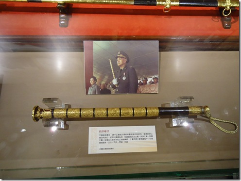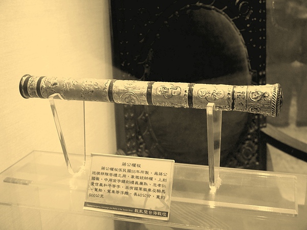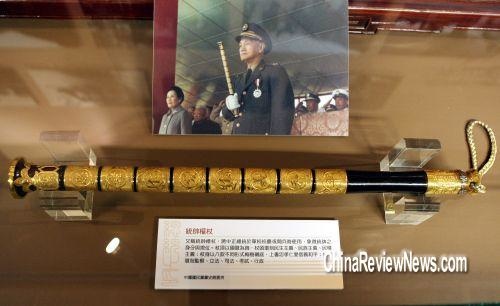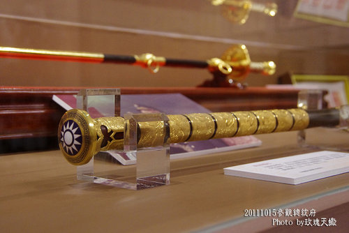 從未在鏡頭前曝光的已故“總統”蔣介石權杖首度在“總統府”與民眾見面,以往蔣介石在閱兵大典時總是威風凜凜,手持這把象徵“三軍統帥”地位的權仗,仔細看看權仗頂端以“國徽”為飾,仗身刻上的箴言更是別有意涵。