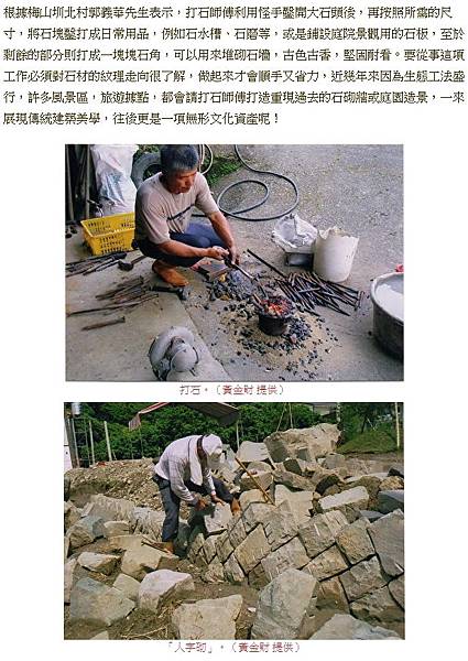根據梅山圳北村郭義華先生表示,打石師傅利用怪手鑿開大石頭後,再按照所需的尺寸,將石塊鑿打成日常用品,例如石水槽、石磨等,或是鋪設庭院景觀用的石板,至於剩餘的部分則打成一塊塊石角,可以用來堆砌石墻,古色古香,堅固耐看。要從事這項工作必須對石材的紋理走向很了解,做起來才會順手又省力,近幾年來因為生態工法盛行,許多風景區,旅遊據點,都會請打石師傅打造重現過去的石砌牆或庭園造景,一來展現傳統建築美學,往後更是一項無形文化資產呢!