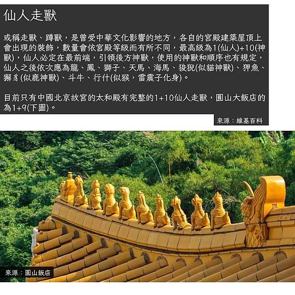 屋簷尾端突出的地方微微上揚,就像要飛起來一般,這是「飛簷」,飛簷上面有幾隻蹲獸,一般來說飛簷上最多有十隻蹲獸,最前端的叫仙人,再來按照順序是龍、鳳、獅子、天馬、海馬、狻猊、押魚、獬豸、鬥牛,但是圓山大飯店的蹲獸只有六隻,因為各地方建築依從習慣,多不遵從官制。斗通常呈現方形或圓形,拱則是呈現長條狀,兩者在橫樑和立柱之間挑出以承擔重量,這就是「斗拱」,這兩個