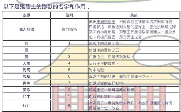 在一般遊客不容易看見的屋頂飛簷上,代表著驅邪避禍的精工,以10尊神獸做為表徵,所謂「龍生九子」的神獸依序排列,最前端再配上「騎鳳仙人」,宮廷建築才具備的雕飾,在此呈現「領路」(領祿)與「逢凶化吉」之意。無頂兩端更配置了巨大的龍頭雕塑,目前正在展出的歷史影像展中,可以看見當時施工的狀態,以及巨大龍頭安置的畫面。