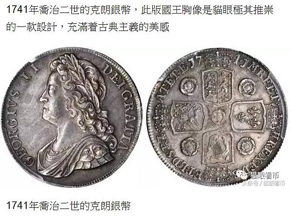 1741年喬治二世的克朗銀幣,此版國王胸像是貓眼極其推崇的一款設計,充滿着古典主義的美感