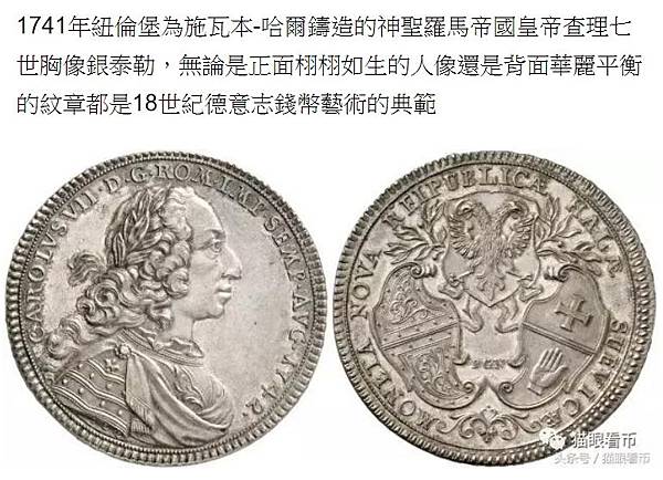 1741年紐倫堡為施瓦本-哈爾鑄造的神聖羅馬帝國皇帝查理七世胸像銀泰勒,無論是正面栩栩如生的人像還是背面華麗平衡的紋章都是18世紀德意志錢幣藝術的典範