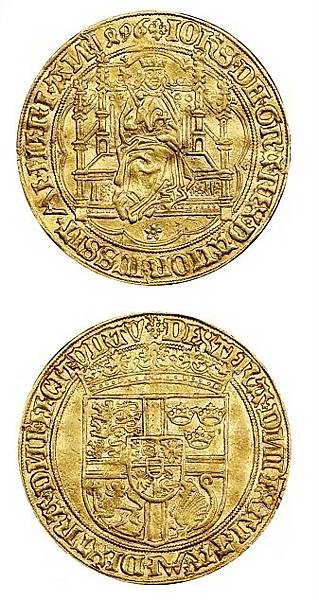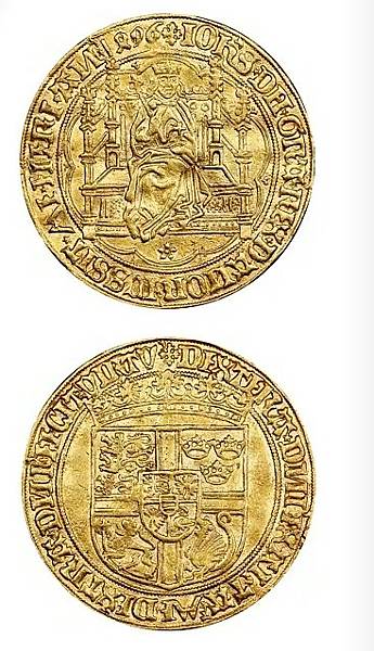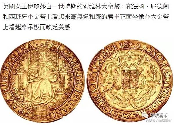 英國女王伊麗莎白一世時期的索維林大金幣,在法國、尼德蘭和西班牙小金幣上看起來毫無違和感的君主正面坐像在大金幣上看起來呆板而缺乏美感