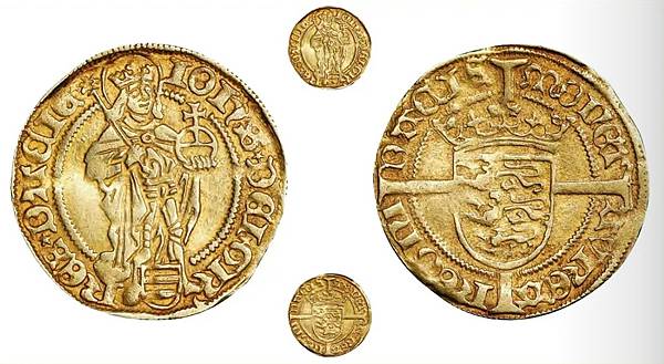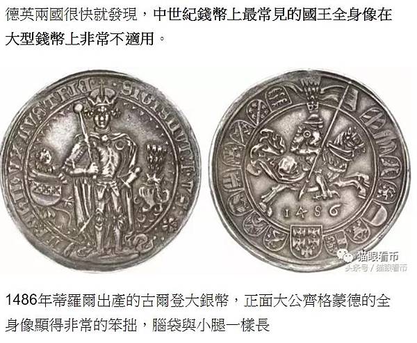 1486年蒂羅爾出產的古爾登大銀幣,正面大公齊格蒙德的全身像顯得非常的笨拙,腦袋與小腿一樣長