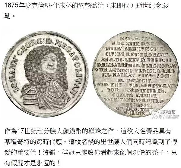 作為17世紀七分臉人像錢幣的巔峰之作,這枚大名譽品具有某種奇特的跨時代感。這枚名錢的出世讓人們同時認識到了假髮的重要性!沒錯,桂冠只能讓你看起來像個深情的禿子,只有假髮才是永恆的!