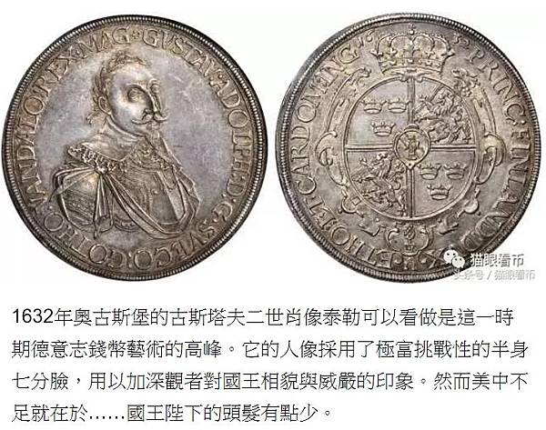 1632年奧古斯堡的古斯塔夫二世肖像泰勒可以看做是這一時期德意志錢幣藝術的高峰。它的人像採用了極富挑戰性的半身七分臉,用以加深觀者對國王相貌與威嚴的印象。然而美中不足就在於……國王陛下的頭髮有點少。
