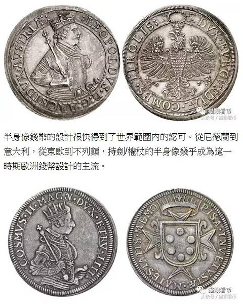 半身像錢幣的設計很快得到了世界範圍內的認可。從尼德蘭到意大利,從東歐到不列顛,持劍/權杖的半身像幾乎成為這一時期歐洲錢幣設計的主流。