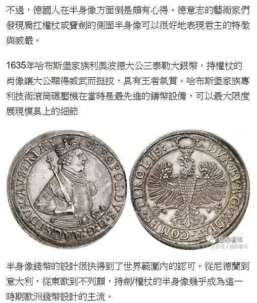 1635年哈布斯堡家族利奧波德大公三泰勒大銀幣,持權杖的肖像讓大公顯得威武而挺拔,具有王者氣質。哈布斯堡家族專利技術滾筒碾壓機在當時是最先進的鑄幣設備,可以最大限度展現模具上的細節